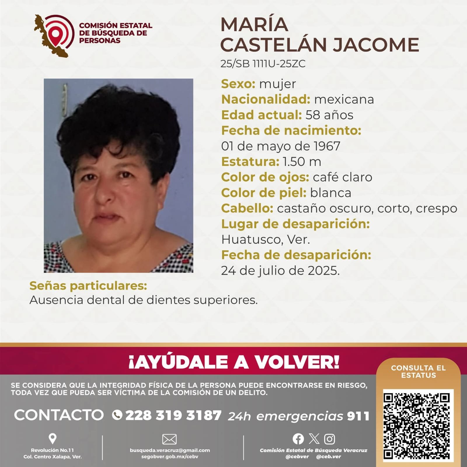 Huatusco, Ver.— María Castellán Jácome, de aproximadamente 60 años de edad, fue reportada como desaparecida luego de que saliera de su domicilio ubicado en la colonia Lira, en el municipio de Huatusco, el pasado jueves 24 de julio con rumbo a la localidad de Boca del Monte, en el municipio de Comapa.